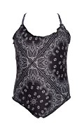 Girls onepiece swimsuit in allover bandana prints. Crossed back. Adjustable straps. Full coverage botton.