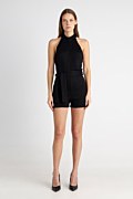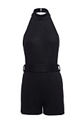 Short monochrome jumpsuit with matching belt detail at the waist for fitted waist style. Features an open back, exposed shoulders and halter neckline. Back fastening with two buttons. Slim fit. Suitable for Christmas parties, festive occasions and evening events. Model wears size S: Height: 1,74cm, Bust: 86cm, Waist: 66cm, Hips: 89cm.
