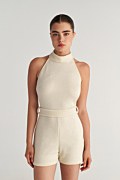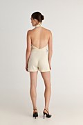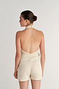 Short monochrome jumpsuit with matching belt detail at the waist for fitted waist style. Features an open back, exposed shoulders and halter neckline. Back fastening with two buttons. Slim fit. Suitable for Christmas parties, festive occasions and evening events. Model wears size S: Height: 1,74cm, Bust: 86cm, Waist: 66cm, Hips: 89cm.