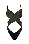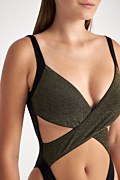 Brazilian onepiece swimsuit with shiny bronze details in allover the fabric that add a touch of luxury and glamour to the swimsuit. Front cutouts with crossed design, light padding with removable pads, open back and low back coverage. Add this glamorous piece to your wardrobe and get ready to turn heads wherever you go!
