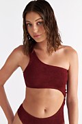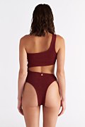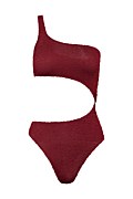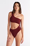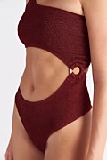 Onepiece brazilian swimsuit in crinkled weave fabric with an asymmetric silhouette. Features a one-shoulder strap, a cutout section at the waist and a decorative metallic ring detail at one side. Unlined, without cups. Low back coverage. *Suitable for body types from small to large sizes.