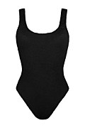 Οnepiece swimsuit in crinkled weave fabric. Features shoulder straps and open back. Unlined, without cups. Moderate back coverage. *Suitable for body types from small to large sizes.