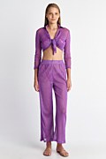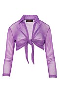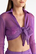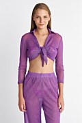 Exclusive semi-sheer crop top in glitter details. Long sleeves, collar and 'V' neckline. It ties with a knot in the front. Perfectly combined with pants 23807326. Model wears size S: Height: 1,81cm, Bust: 88cm, Waist: 62cm, Hips: 91cm.