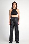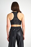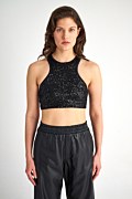 Exclusive sleeveless crop top. It has a high neck and sequins in allover the fabric. Very cropped length.