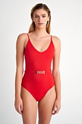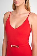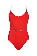 Fashion solids onepiece swimsuit with a 'V' neckline and thin straps that cross at the back. Μatching belt with metal accessory adding a hint of glamour to your look. Moderate back coverage.