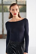 Long-sleeved stretch bodysuit in monochrome style. Features a boat neckline and open back. Concealed press-studs at the crotch.