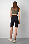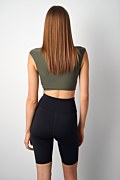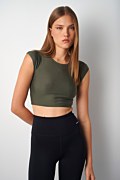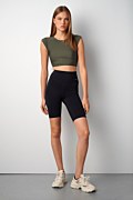 Monochorme fitted sports crop top with scoop neckline and short sleeves.