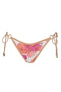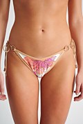 Low rise bikini slip with decorative rings. Allover floral print and ties at sides. Moderate back coverage.