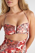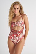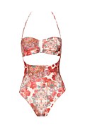 Strapless onepiece swimsuit in allover floral print and front cut-out details. Features removable strap that ties at the neck and light padding with removable pads. Inner, concealed silicone trim at the top to keep it in place. Moderate back coverage.