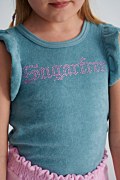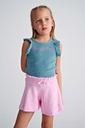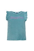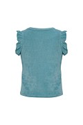Sleeveless terry top for girls. Features scoop neckline, ruffles on the sleeves and colorful strass embellishments at the front side. Regular fit.