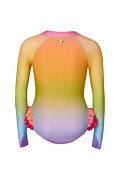 Multicolor, long sleeved onepiece swimsuit for girls. Scoop neckline and front zipper closure. Ruffled at the sides. The brief is fully back coverage.