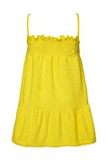 Monochrome girls terry dress in A-line. Thin straps, side pockets, smoked elastic band at the back side and ruffles at the hem.