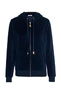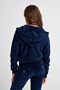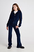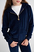 Monochrome velour jacket in fashionable colors for teens with patch pockets at the front side. Double hoodie, adjustable drawstring and gold logo heart puller. Elastic bands in both waist and sleeves, iconic heart zipper and heart stoppers. Regular fit. Our girls can combine it with the pants 25631000 for a perfect outfit. Model wears size PXXS: Height: 1,40cm.