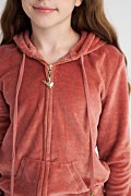 Monochrome velour jacket in fashionable colors for teens with patch pockets at the front side. Double hoodie, adjustable drawstring and gold logo heart puller. Elastic bands in both waist and sleeves, iconic heart zipper and heart stoppers. Regular fit. Our girls can combine it with the pants 25631000 for a perfect outfit. Model wears size PXXS: Height: 1,40cm.