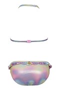 Swimwear bikini set for girls with an allover multicolored iridescent print. Ruffles and clasp at the back side. The brief is fully back coverage.