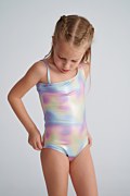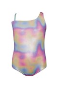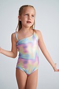 One shoulder onepiece swimsuit for girls with an allover multicolored iridescent print. Fully back coverage.