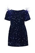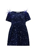 Super soft velour dress for girls featuring sequins throughout the fabric that create a stunning sparkling effect. Features a scoop neckline, an elastic waistband for a fitted waist style and short sleeves adorned with bold blue feather details, adding movement and luxury to the outfit. Regular fit. Suitable dress for special occasions and festive Christmas events. Model wears size 8: Height: 1,30cm.