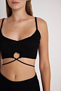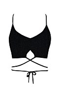 Monochrome cropped knitted top with thin straps. Featuring a 'V' neckline and long thin drawstrings at the front, which tie crosswise around the waist. Combine it with the skirt 24805311 and you will surely impress with your perfect look. Model wears size S: Height: 1,81cm, Bust: 88cm, Waist: 62cm, Hips: 91cm.