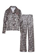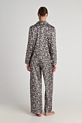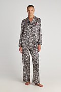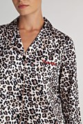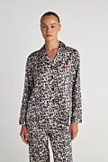 Leopard printed satin pyjama set with brown contrast piping details. Jacket with a collar and Sugarfree logo on the chest. Front buttons closure. Pyjama pants with an elastic waistband for a firm fit. Relaxed, loose fit. Model wears size S: Height: 1,78cm, Bust: 83cm, Waist: 60cm, Hips: 91cm.