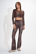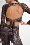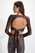 Leopard printed sports crop top with scoop neckline, long sleeves and open back. Features a tie at the back that can be tied either at the hem of the top or wrapped around the waist for a different style. This versatile top is perfect for daily workouts, yoga sessions, or casual everyday looks! Combine it with the sports pants 25841116 for a perfect outfit.