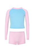 Multicolor bikini set for girls with long sleeves. The top features a scoop neckline and is paired with a matching shorts bikini bottom. This beautiful and functional set is designed to protect our young girls from the sun and cold as they discover the joys of the water.