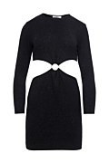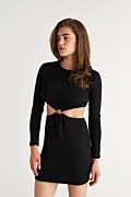 Monochrome mini dress with long sleeves. Features a decorative metallic ring at the waist, a scoop neckline and side cut-outs that highlight the silhouette. Suitable for evening outings, parties, or special occasions with style. Model wears size S: Height: 1,74cm, Bust: 86cm, Waist: 66cm, Hips: 89cm.