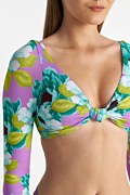 Floral printed long sleeved swimwear cropped bikini top. V' neckline with a knot at the front side and open back. Light padding with removable pads. Clasp at the back.
