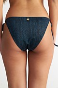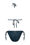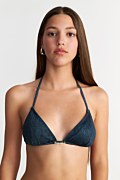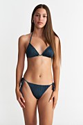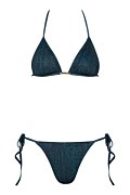 Monochrome swimwear bikini set for teens. Consists of triangle bikini top featuring a chic metallic Sugarfree accessory at the front and light padding with removable pads. Adjustable ties at the neck and back. Tie-side bikini bottom and moderate back coverage.