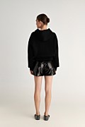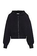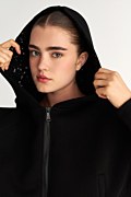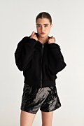 Monochrome hooded jacket embellished with black sequins on the inside of the hood, adding a subtle touch of sparkle and elegance. Features long sleeves, side welt pockets, and elastic ribbed bands in both waist and sleeves. Front zipper closure. Relaxed, loose fit. Suitable for both casual outfits and special occasions. Model wears size S: Height: 1,74cm, Bust: 86cm, Waist: 66cm, Hips: 89cm.