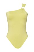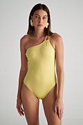 Monochrome onepiece swimsuit in one shoulder. Light padding with removable pads and open back. Moderate back coverage.