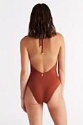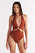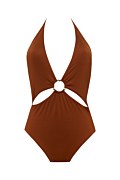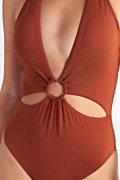 Monochrome onepiece swimsuit with open back. Features a deep 'V' neckline, a metallic decorative ring accessory at the front, cutouts at the front side and light padding with removable pads. Ties at the neck. Moderate back coverage.