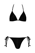Monochrome swimwear bikini set for teens made of ribbed fabric. Consists of triangle bikini top featuring a chic metallic Sugarfree accessory at the front and light padding with removable pads. Adjustable ties at the neck and back. Tie-side bikini bottom and moderate back coverage.