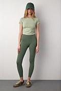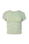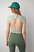 Monochrome crop top with scoop neckline and short sleeves. Gathered seams on the sides to create a gently draped effect, open back and "WORK IT OUT" logo at the back side. Suitable during your workout!