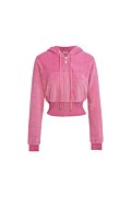 Monochrome cropped velour jacket with wide elastic banded waist. Patch pockets at the front, double hoodie, adjustable drawstring and gold logo heart puller. Heart zipper and heart stoppers. Relaxed fit. Combine it with the pants 26811073 for a perfect style. Model wears size S: Height: 1,78cm, Bust: 88cm, Waist: 63cm, Hips: 91cm.