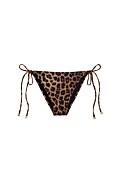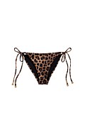 Leopard printed tie-side bikini brief. Feauters an adjustable side ties and moderate back coverage.