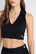 Monochrome crop top with collar and 'V' neckline. Features an iconic Sugarfree logo on the front side and open back. Suitable during your workout! Combine it with the skort 26844025 for a perfect outfit. Model wears size S: Height: 1,77cm, Bust: 83cm, Waist: 62cm, Hips: 89cm.