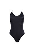 Monochrome onepiece swimsuit. Features a scoop neckline and thin crisscross straps. Moderate back coverage.