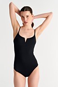 Sugarfree is committed to our ongoing initiative for sustainibility. This high quality swimsuit is made from regenerated polyamide fibres. We are proudy committed initiative for sustainability. By wearing this unique swimsuit, you become part of the enviromental protection chain. This monochrome onepiece swimsuit covers almost most of the upper part of your body but at the same time it remains sexy and elegant with its subtle slit in the front in a 'V' shape. Features an adjustable shoulder straps, light padding with removable pads and moderate back coverage. Material: This garment is made with ECONYL® regenerated nylon which is created from rescued recyclable waste, has high resistance to chlorine and to contact with sunscreens and oils and is unlimitedly recyclable. Its composition offers excellent coverage with great abrasion resistance (78%pa-22%ea).