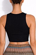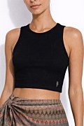 Monochrome sleeveless halter neck ribbed top without seams. Features a scoop neckline and athletic back. Slim fit. Cropped length.