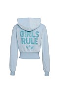 Monochrome cropped velour jacket with wide elastic banded waist adorned with strass at the back side. Patch pockets on the front, double hoodie, and Sugarfree logo heart puller. Heart zipper and heart stoppers. Regular fit. Combine it with the pants 26811073 for a perfect style. Model wears size S: Height: 1,78cm, Bust: 88cm, Waist: 63cm, Hips: 91cm.