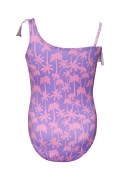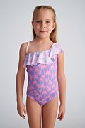 One shoulder onepiece swimsuit for girls. Allover printed and ruffles. Fully back coverage.