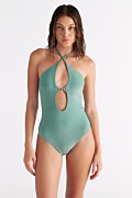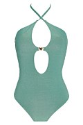 Οnepiece swimsuit in front exposed cut-outs details. Light padding with removable pads and open back. Ties at the neck and it has moderate back coverage.