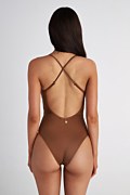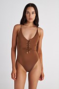 This onepiece swimsuit is designed to make you stand out at the beach or by the poolside. Features metal studs at the front with a lace-up detail, light padding at the bust with removable pads and thin, adjustable criss-cross straps at the back. Moderate back coverage.