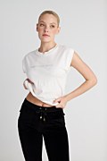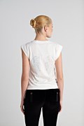 Monochrome t-shirt made from organic cotton. Features a scoop neckline and is adorned with strass embellishments on the front and back. Relaxed, loose fit. Suitable for wearing from morning to night! Model wears size S: Height: 1,78cm, Bust: 88cm, Waist: 63cm, Hips: 91cm.