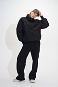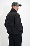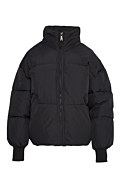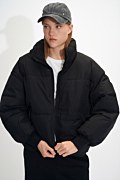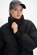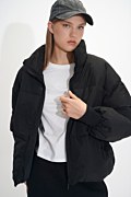 Oversized monochrome puffer jacket in a quilted weave. Stand-up collar, front zipper pockets, long sleeves with wide elasticated cuffs and inner lining. Front zipper closure. Loose fit.