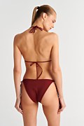 Sugarfree is committed to our ongoing initiative for sustainibility. This high quality swimsuit is made from regenerated polyamide fibres. We are proudy committed initiative for sustainability. By wearing this unique swimsuit, you become part of the enviromental protection chain. This triangle bikini top has a light padding with removable pads and adjustable ties at the neck and back for a custom fit. The monochrome style allows you to mix and match it with many bikini bottoms. Material: This garment is made with ECONYL® regenerated nylon which is created from rescued recyclable waste, has high resistance to chlorine and to contact with sunscreens and oils and is unlimitedly recyclable. Its composition offers excellent coverage with great abrasion resistance (78%pa-22%ea).