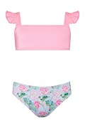 Swimwear bikini set for girls. Shoulder straps with ruffles and clasp at the back side. The brief is fully back coverage.