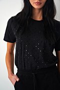 Monochrome t-shirt made from organic cotton. Featuring sparkling strass embellishments on the front, adding a touch of glam to any outfit and scoop neckline. Regular fit. Suitable for wearing from morning to night! Model wears size S: Height: 1,76cm, Bust: 85cm, Waist: 61cm, Hips: 91cm.