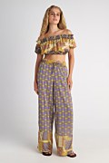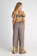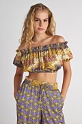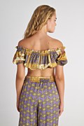 Μulticolor printed satin cropped top. Features short sleeves and off-the-shoulder design. Combine it with the pants 25807744 for a complete look. Model wears size S: Height: 1,79cm, Bust: 84cm, Waist: 60cm, Hips: 90cm.