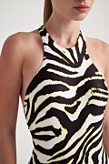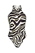 Zebra printed onepiece swimsuit with scoop neckline. Light padding with removable pads and wide strap at the back side. Moderate back coverage.